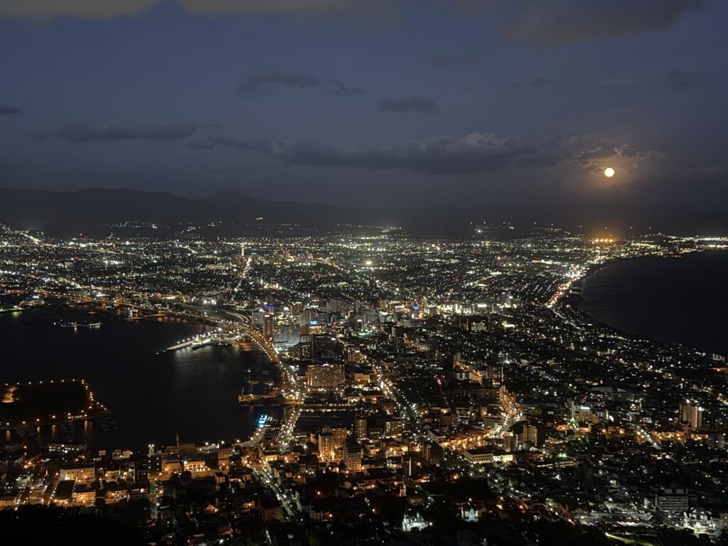 4日目の函館旅行中は、中秋の名月の週だったので 満月と夜景のコラボをのんびりと眺めることが出来ました。夜景の煌めきに浮かぶ美しい満月・・・夢のような偶然に感激です。