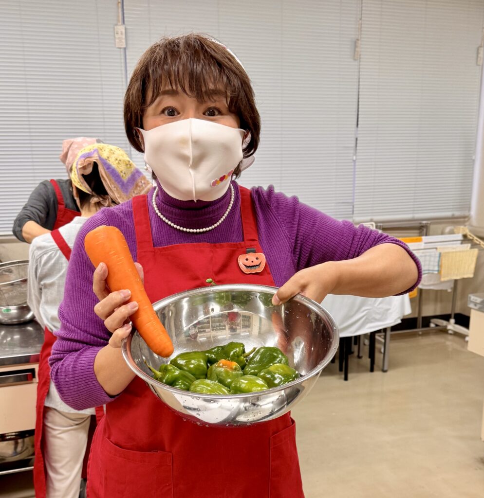 さて今回のメニューは「青椒肉絲」と「茄子とベーコンのチーズ焼き」「里芋のスイーツ団子」。私は青椒肉絲チームになり、とりあえず大量のピーマンの細切りからスタートしました。