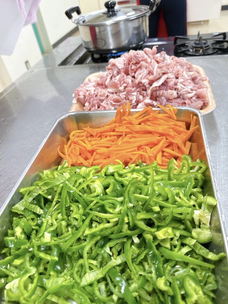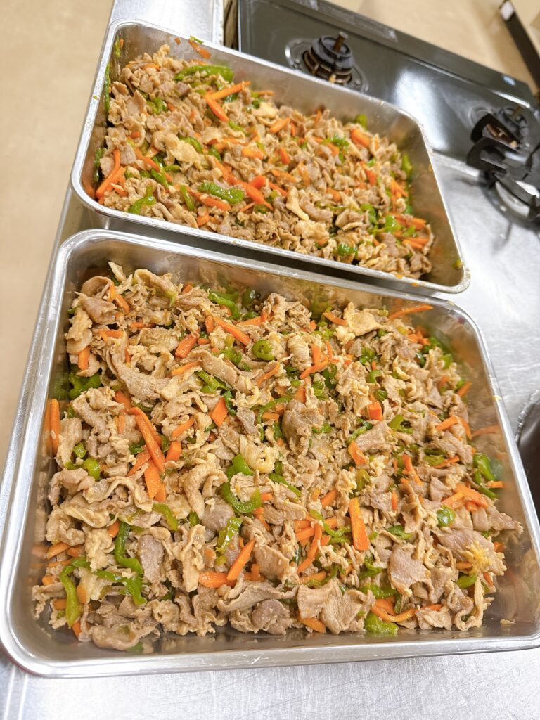 30人分以上のお食事を作る時、煮物以外は一度に出来ないので 炒め物などは数回に分けて作業していきます。青椒肉絲も、5回に分けて作っていきました。