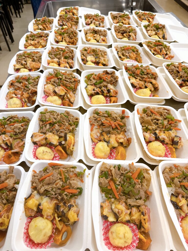 詰める作業もみんなで ササっと分業になるので、本当に楽しい。チームワーク抜群です。毎回のことながら、出来たお弁当が並ぶと、本当に嬉しい。この眺めがご褒美です。