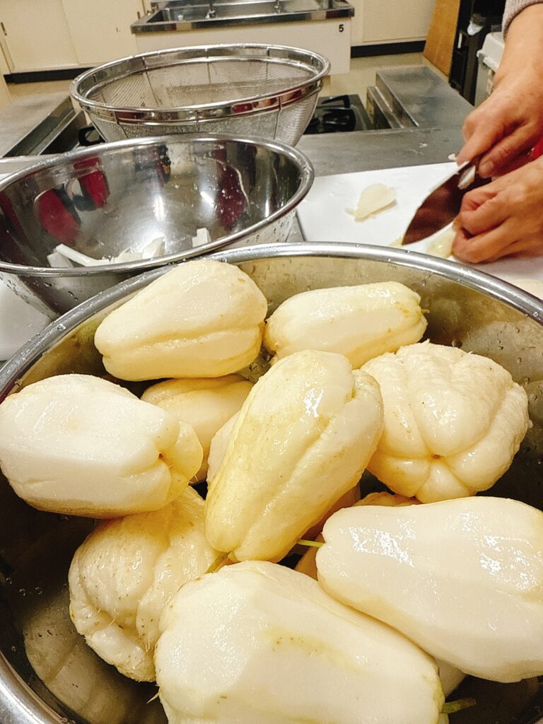 大量にある「はやと瓜」は キンピラにしていきますが、形もいびつなので 皮むきも、細切りも大変そう。でも ベテランメンバーさんなので手早い。