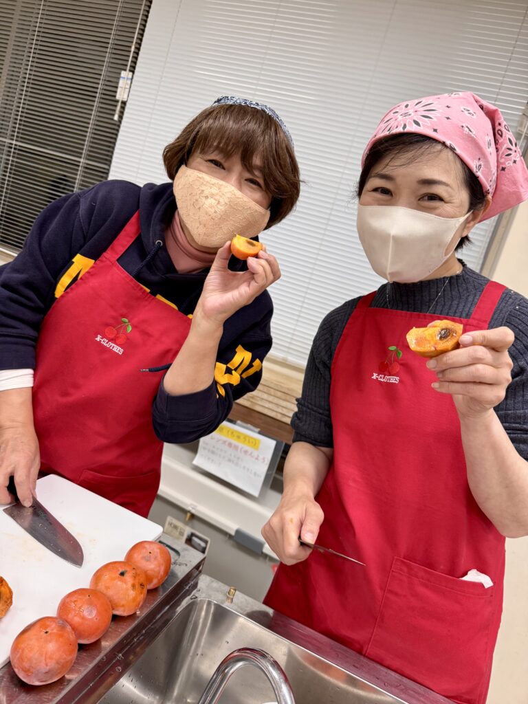 一番、難しいご飯担当のメンバーは、常に全体を観たり、調味料を作ってくださるので本当に頼りになります。ご飯を気にしつつ、大量の柿剥きも。