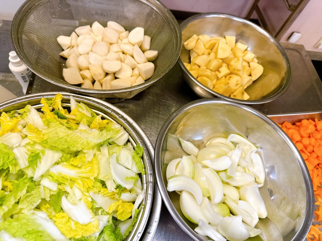 「鶏肉とカブ・白菜の温かいクリームシチュー」チームは、とりあえず、野菜のカットに集中。白菜・カブ・玉ねぎ・人参・じゃがいも、そして鶏肉をひたすらカットしていきました。40人分のシチューを作ります。