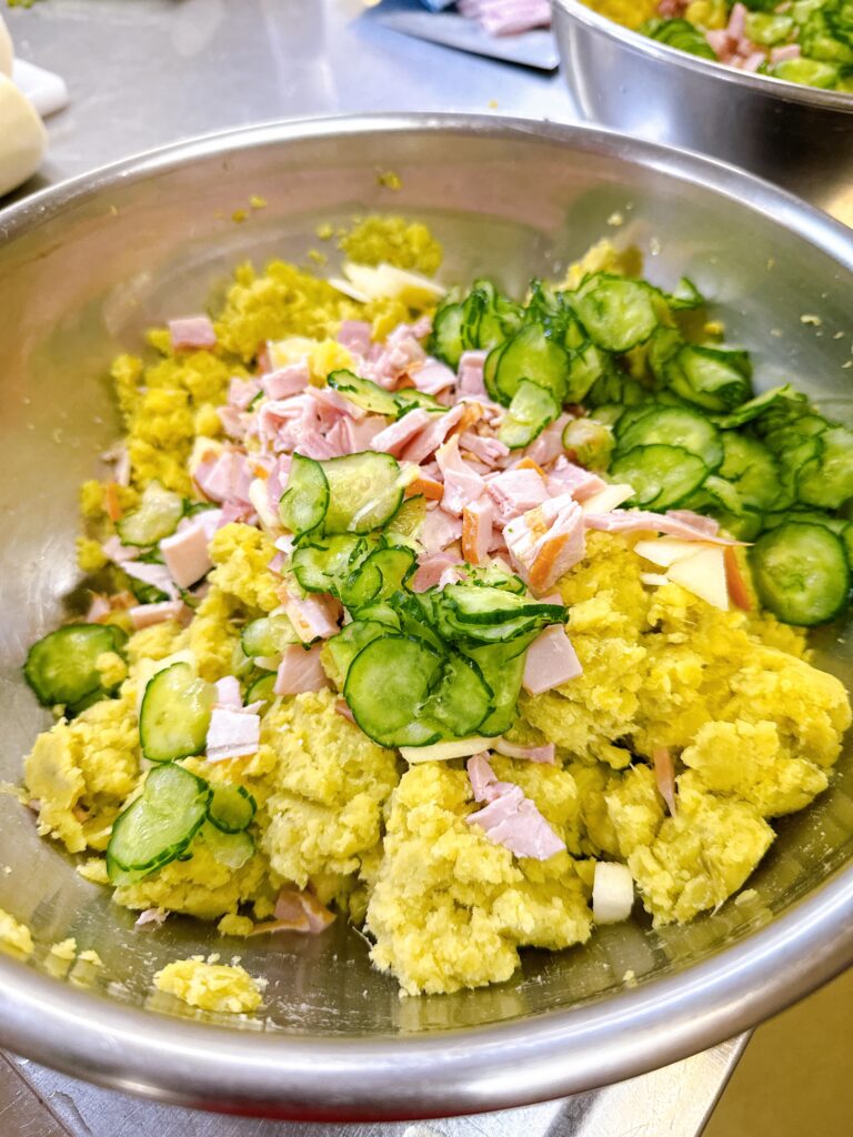 茹でたサツマイモをマッシャーし、ハム・林檎・きゅうりを加えます。林檎の隠し味が サツマイモの甘さに絶妙にマッチして、美味しい。