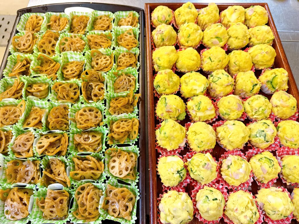 サツマイモのサラダは丸く、蓮根のキンピラと大根とハムの箸休めも美味しく仕上がりました。