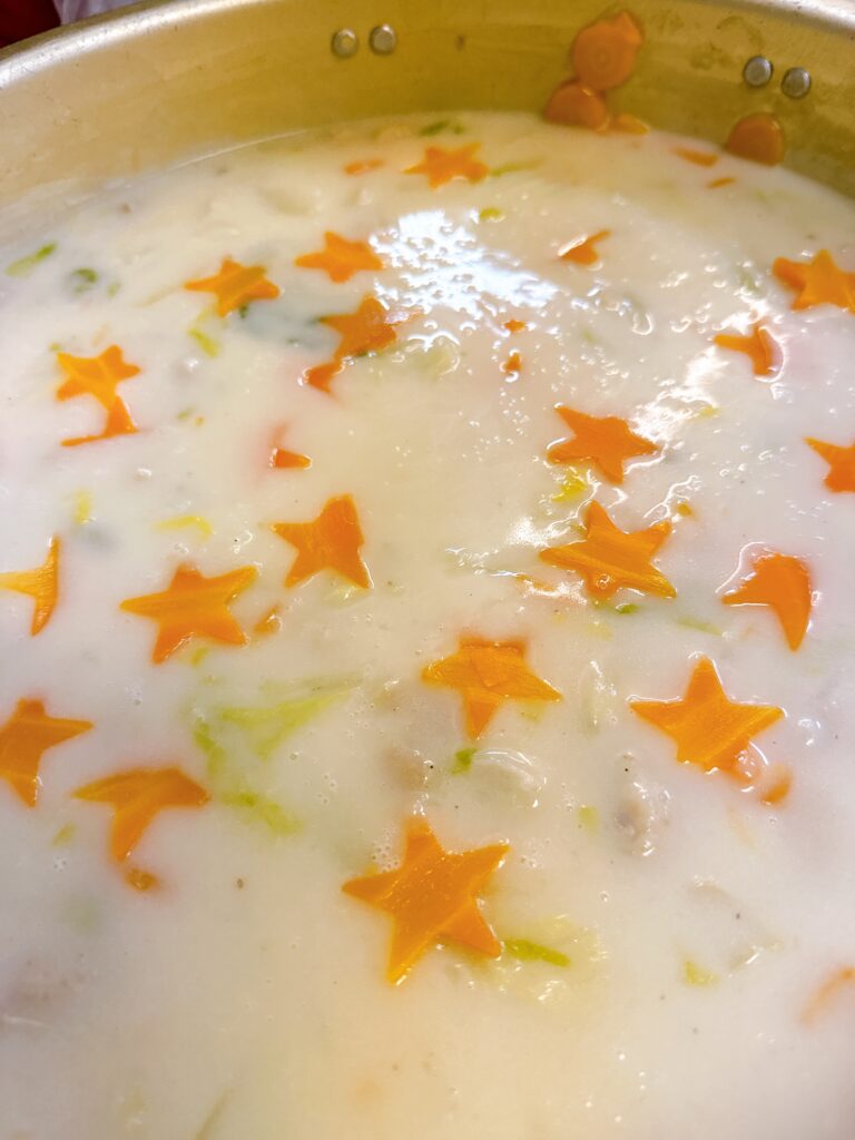 お野菜の旨みと鶏肉がいっぱい入ったクリーシチューと星型の人参、喜んでもらえたら嬉しいなぁ。ご飯の横に温かく添えて頂くパターンは人気なのです