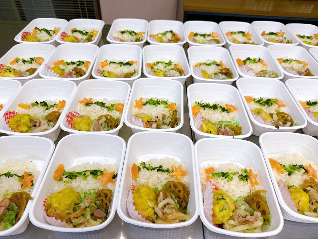 あとは流れ作業でお弁当にしていきますが、どこにどう詰めるかは毎回、みんなで彩りポイントも考えます。