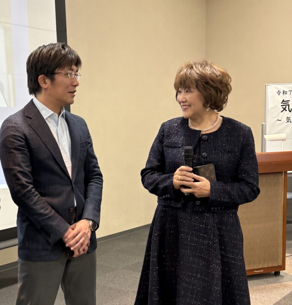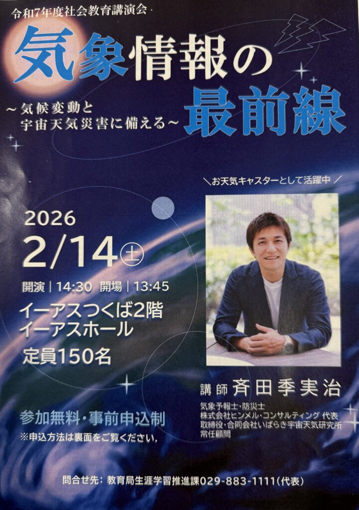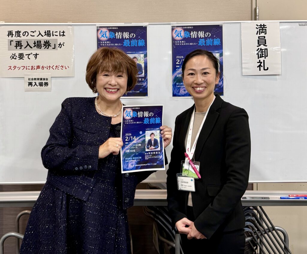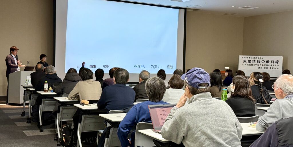 NHK「ニュースウオッチ9」の気象キャスターとしても人気の気象予報士:斉田季実治氏による「気象情報の最前線~気候変動と宇宙天気災害に備える~」と言う演題の講演会で進行役を務めさせて頂きました。この講演会は「令和7年度 社会教育講演会」として開催されたものですが、定員150名のところ、220名を超える応募があり、厳正なる抽選で当選された皆様で、会場は満席となりました。