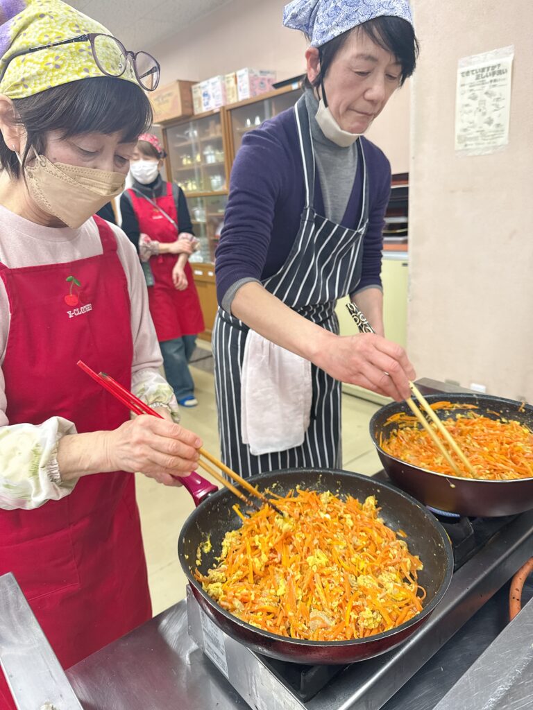 「人参と卵のしりしり」チームは、大量の人参の千切りからスタート。先鋭部隊なので、実にリズミカルに美しく、大量の人参をどんどん細切りにしていきました。