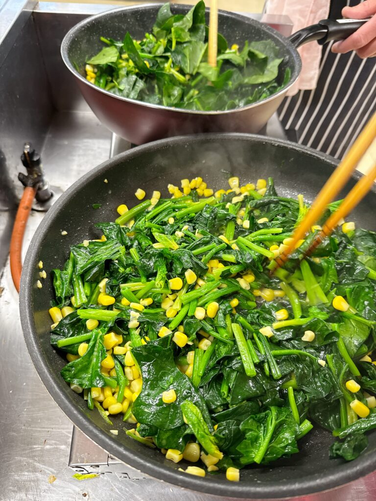 「ほうれん草のコーンのバター醤油炒め」では、大量のほうれん草を使いましたが、炒めると量が小さくなります。
